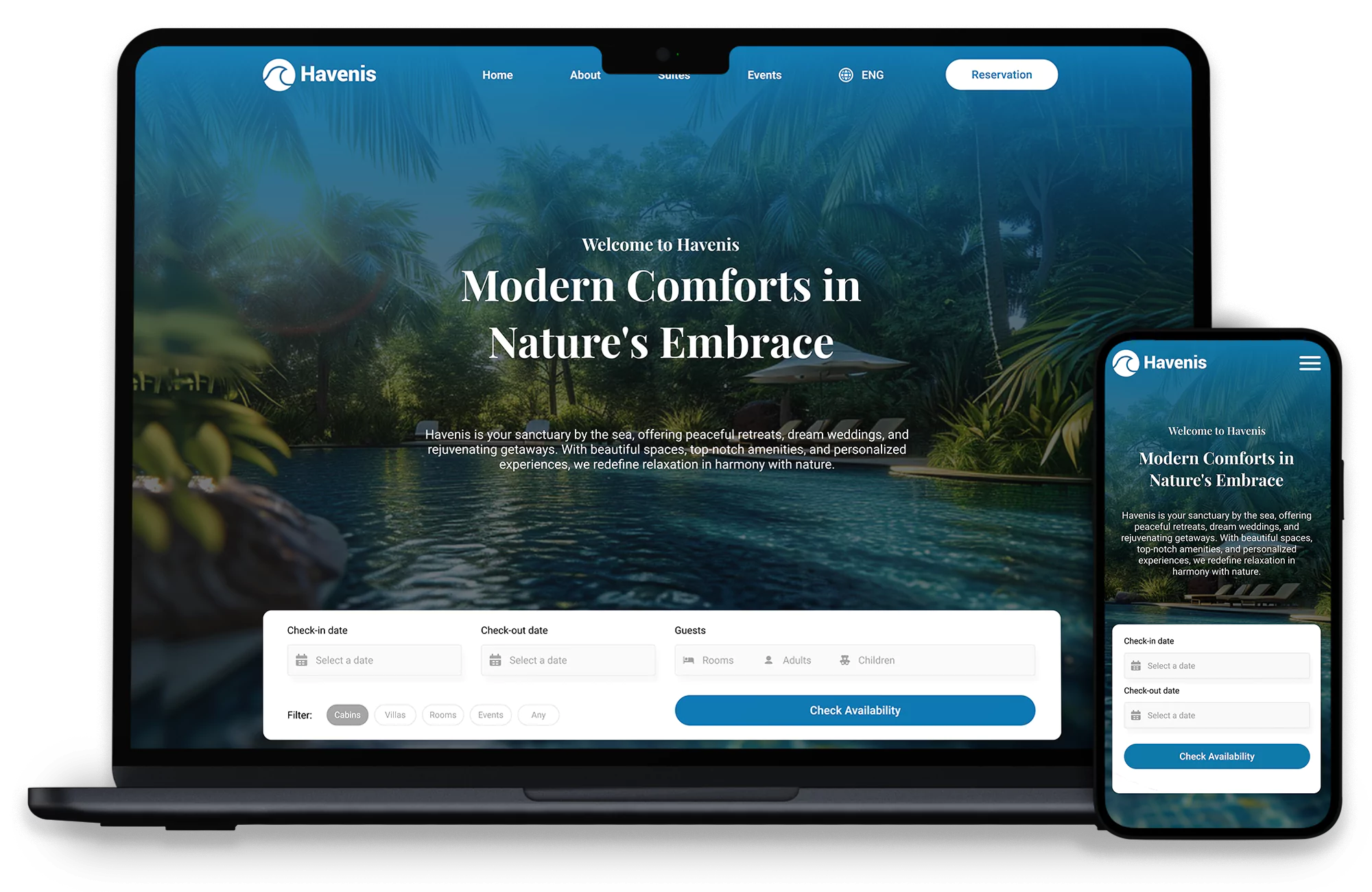 Capturing the serene yet luxurious atmosphere of Havenis was a key challenge, as the website needed to balance immersive visuals with ease of navigation. Another challenge was ensuring that the site performed optimally, providing fast loading times without compromising on the quality of the images or user experience.