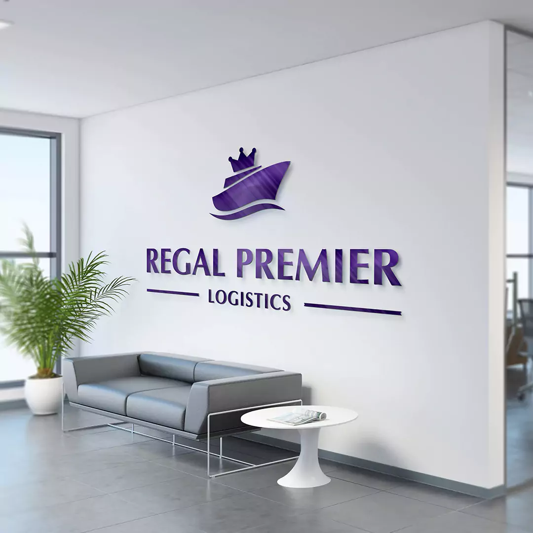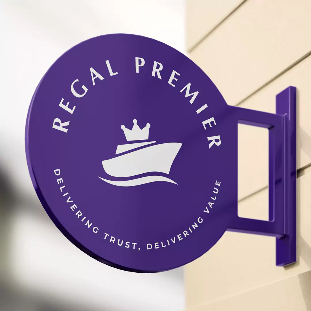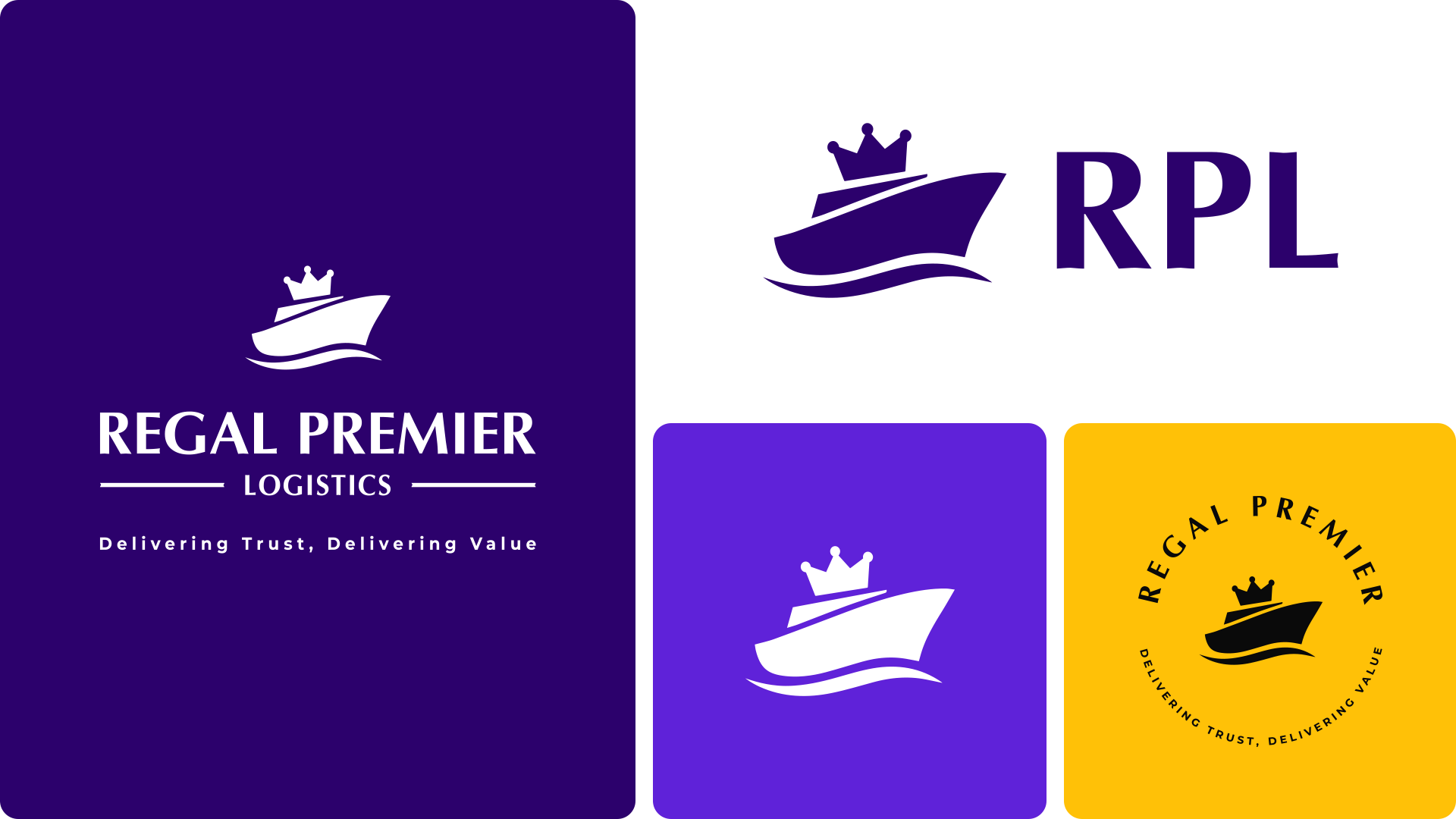 The Regal Premier Logistics logo combines a crown to symbolize authority and premium service with a ship that represents global shipping and logistics. Purple was chosen as the primary color to highlight royalty, prestige, and professionalism. The overall identity positions Regal Premier Logistics as a distinguished and trustworthy provider.