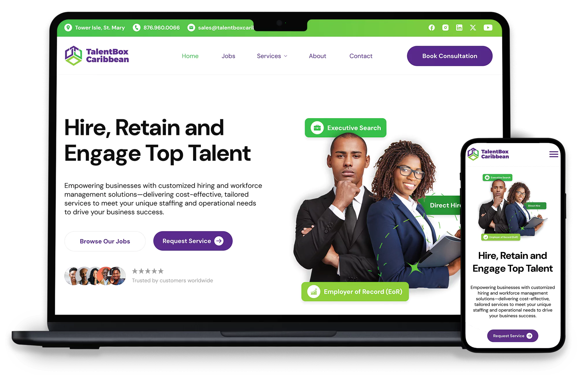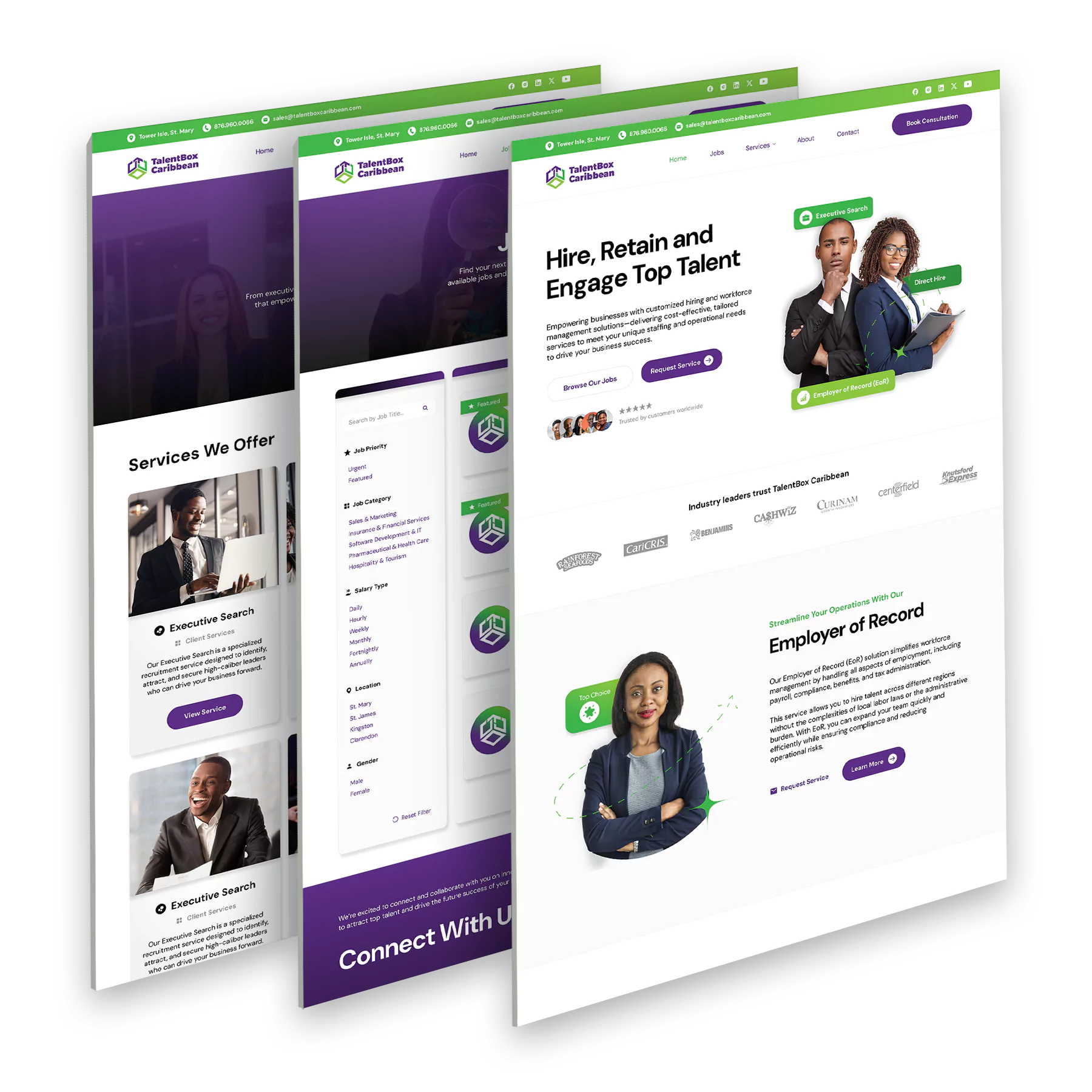 - Service Showcase: Clear and detailed presentation of Direct Hire, Executive Search, and Employer of Record services.